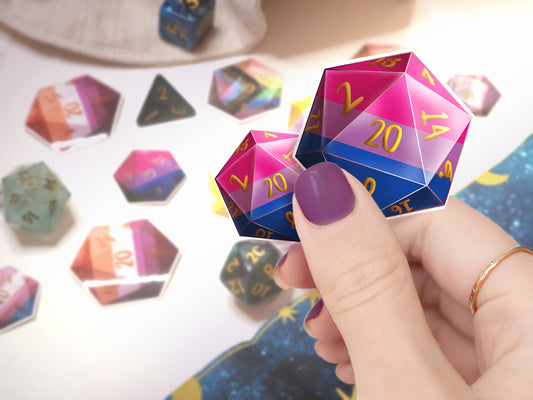 Bi PRIDE DICE Vinyl Sticker set of 9 Semi-glossy Dishwasher-safe laminated vinyl Polyhedral Dice Bisexual stickers DnD D20 TTRpg