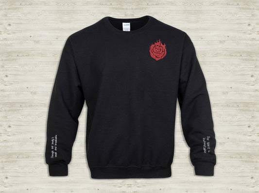 Ruby Rose Emblem Embroidered unisex Sweatshirt with Indomitable quote on sleeve Custom made black novelty pullover sweater for RWBY fans
