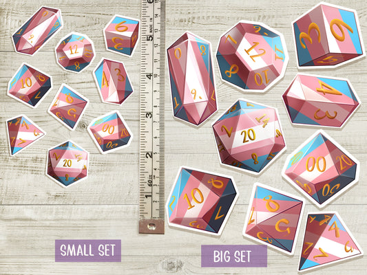 TRANS PRIDE DICE Vinyl Sticker set of 9 Semi-glossy Dishwasher-safe laminated vinyl Transgender Pride Polyhedral Dice stickers DnD D20 TTRpg