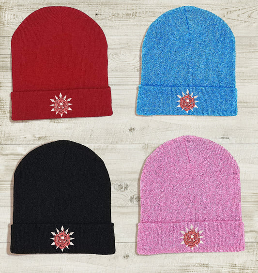 Ruby Rose Embroidered Beanie hat | Custom cozy winter knitted skull cap with Ruby's emblem