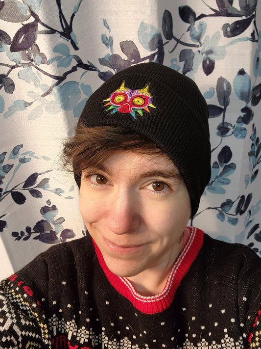 Majora's Mask Embroidered Beanie hat | Custom cozy winter knitted skull cap with TLoZ Skull Kid Majoras Mask